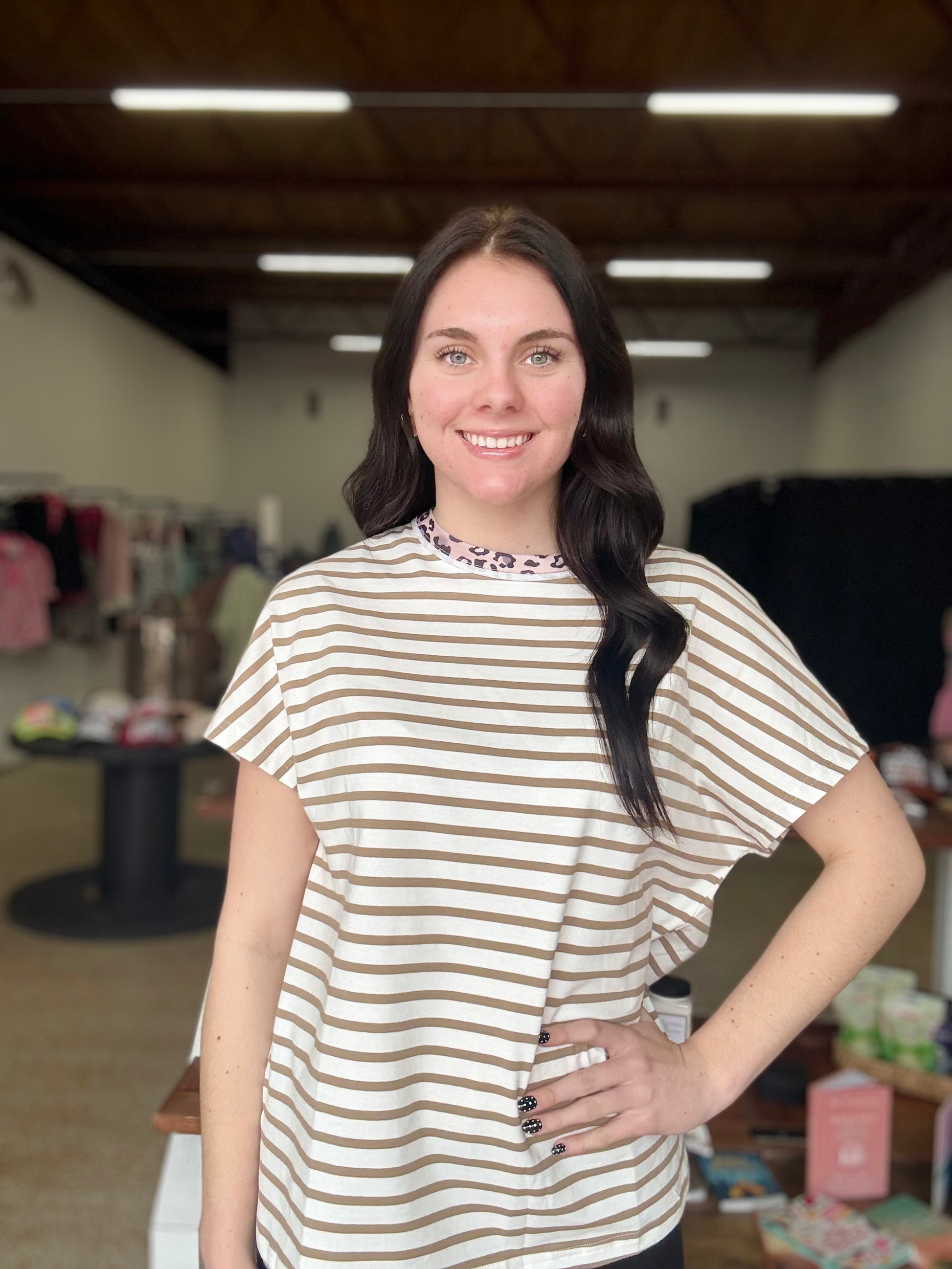 Khaki striped and cheetah round neck loose tee