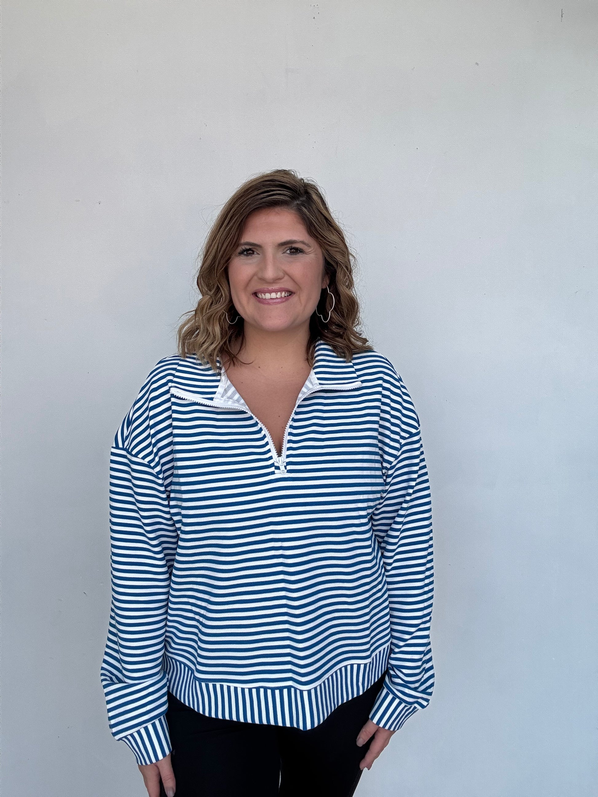 Blue Striped Quarter Sleeve Zip Collared Pullover Long Sleeve