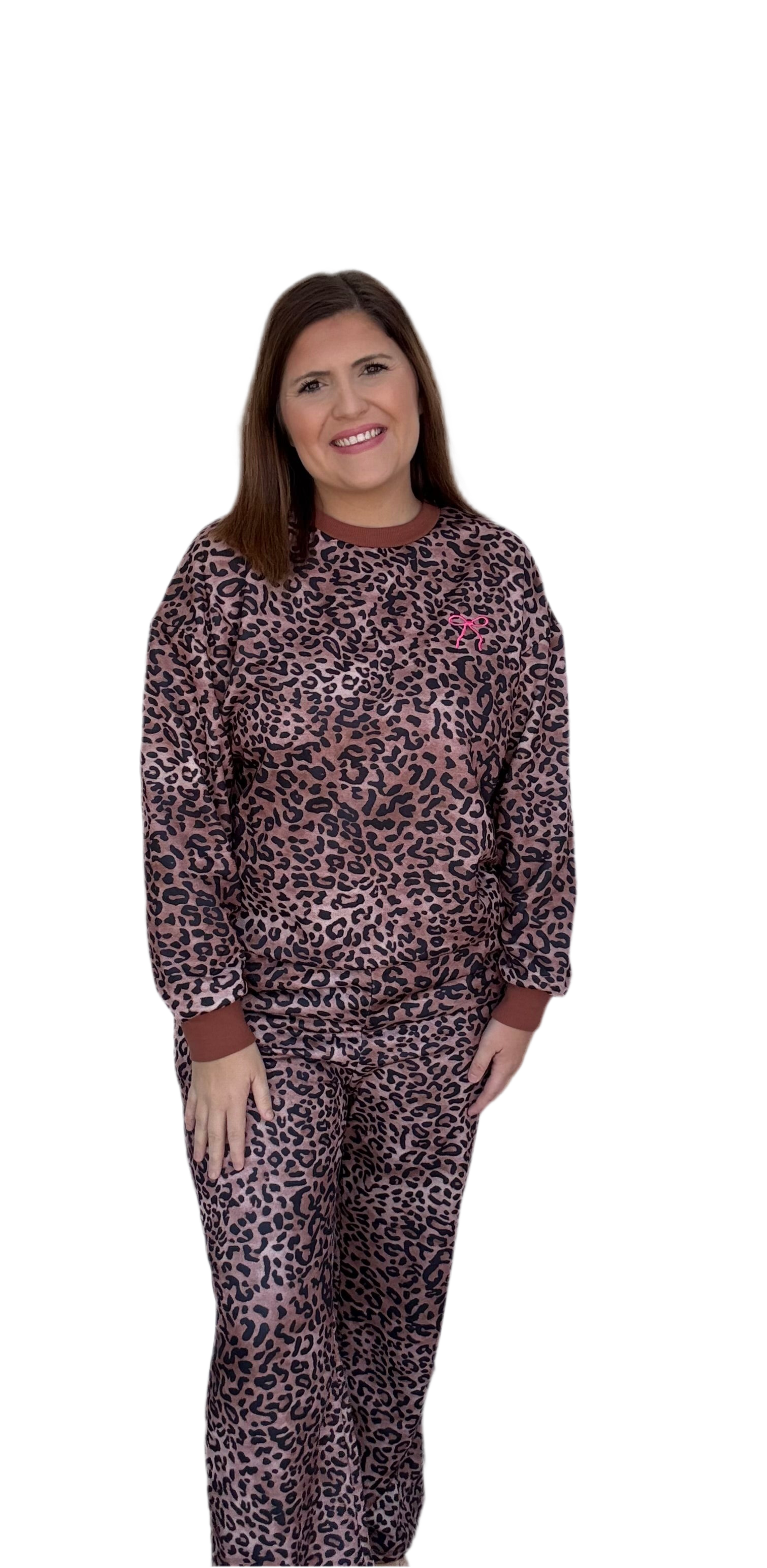 Cheetah print pullover and pants sets with a small pink bow detail