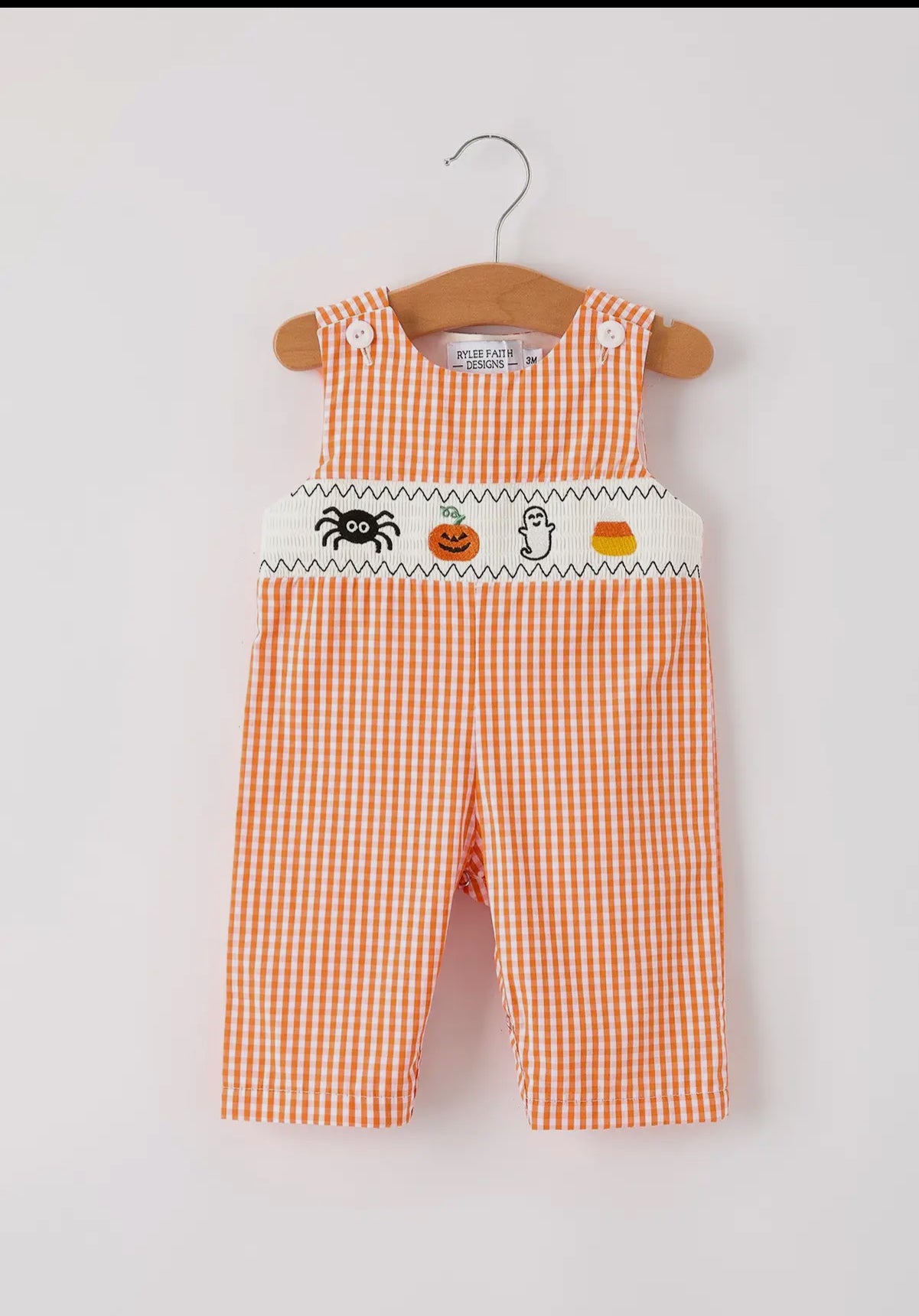 fall halloween orange pumpkin ghost spider smock embroidery Romper