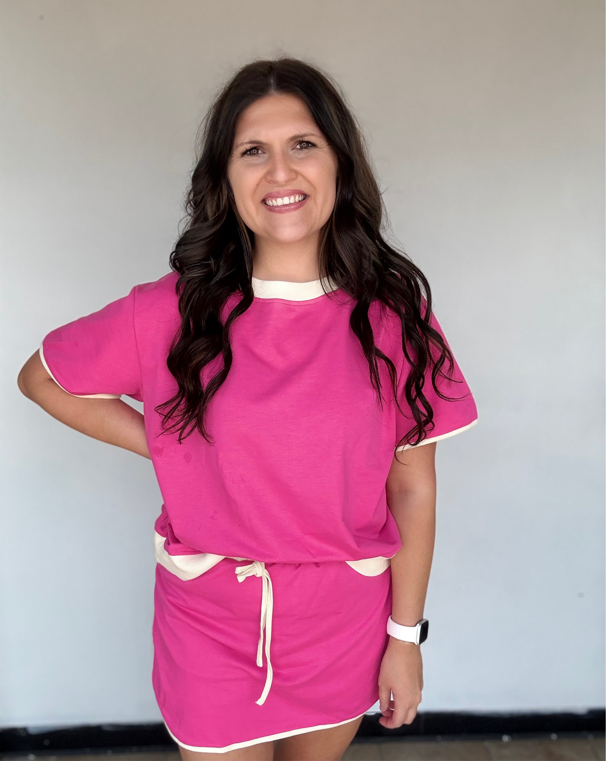 Pink color block edge drop shoulder skort set