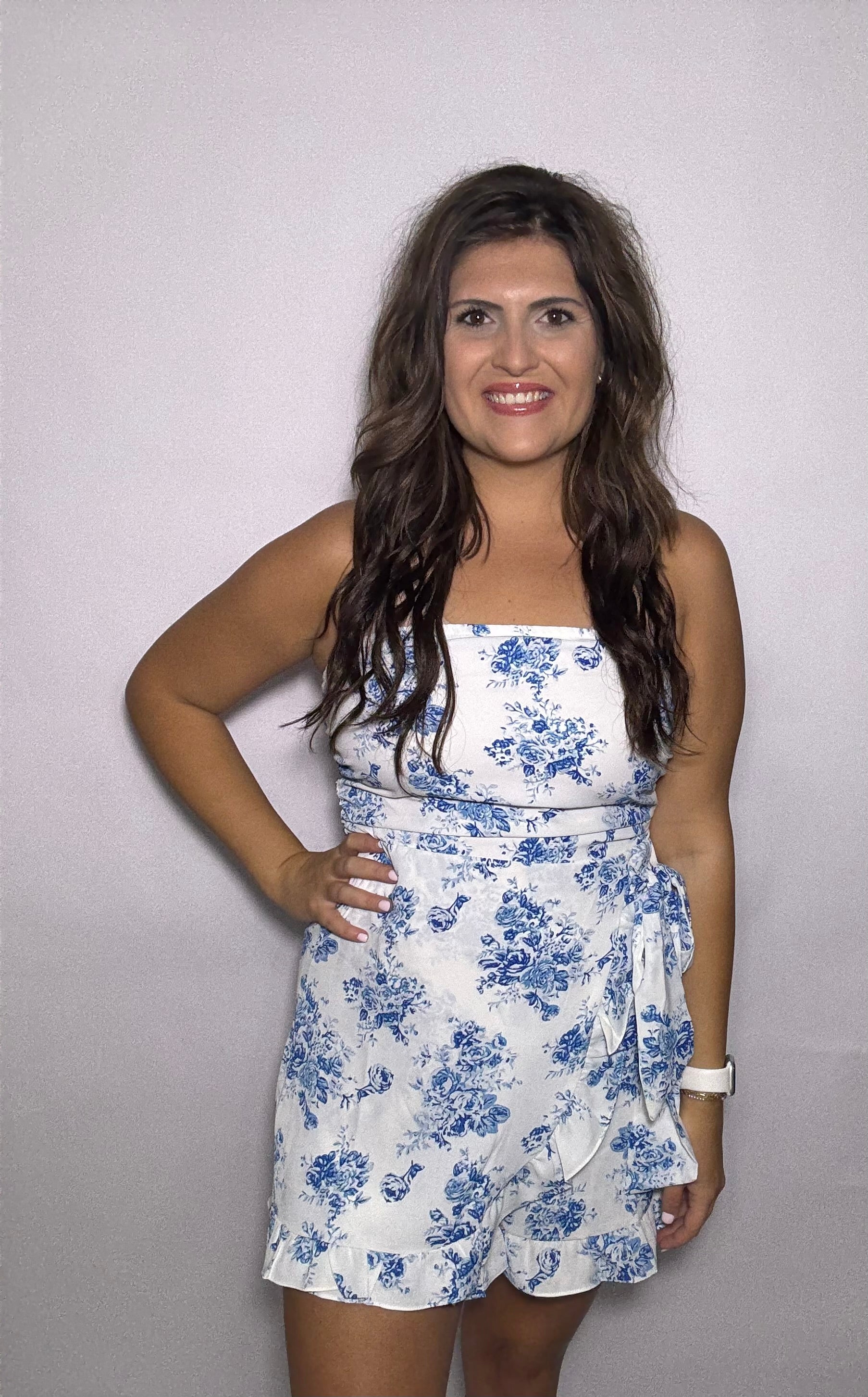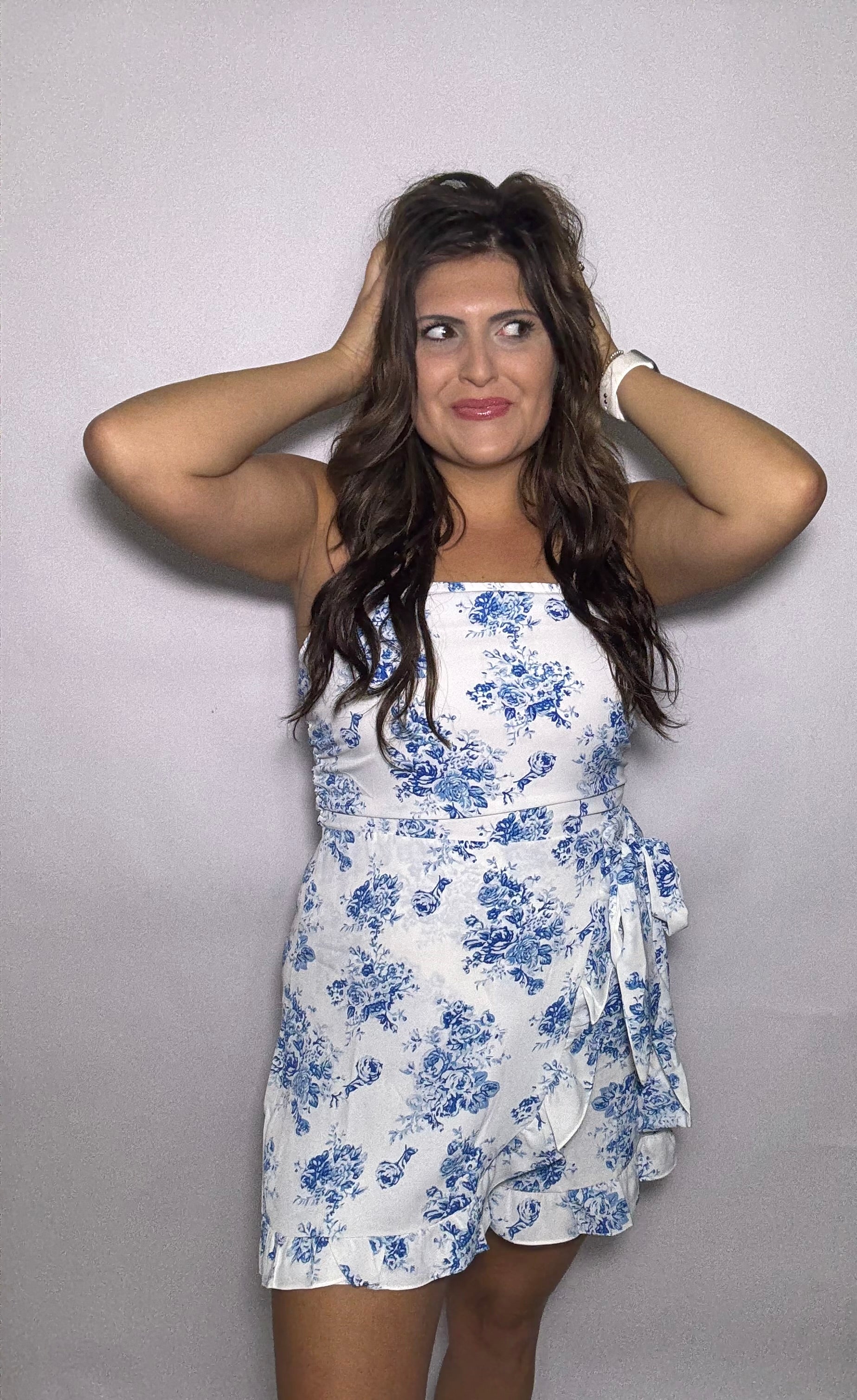 features a delicate blue floral print on a crisp white background, a flattering square neckline, and a ruffle-trimmed wrap front that ties at the waist for the perfect fit