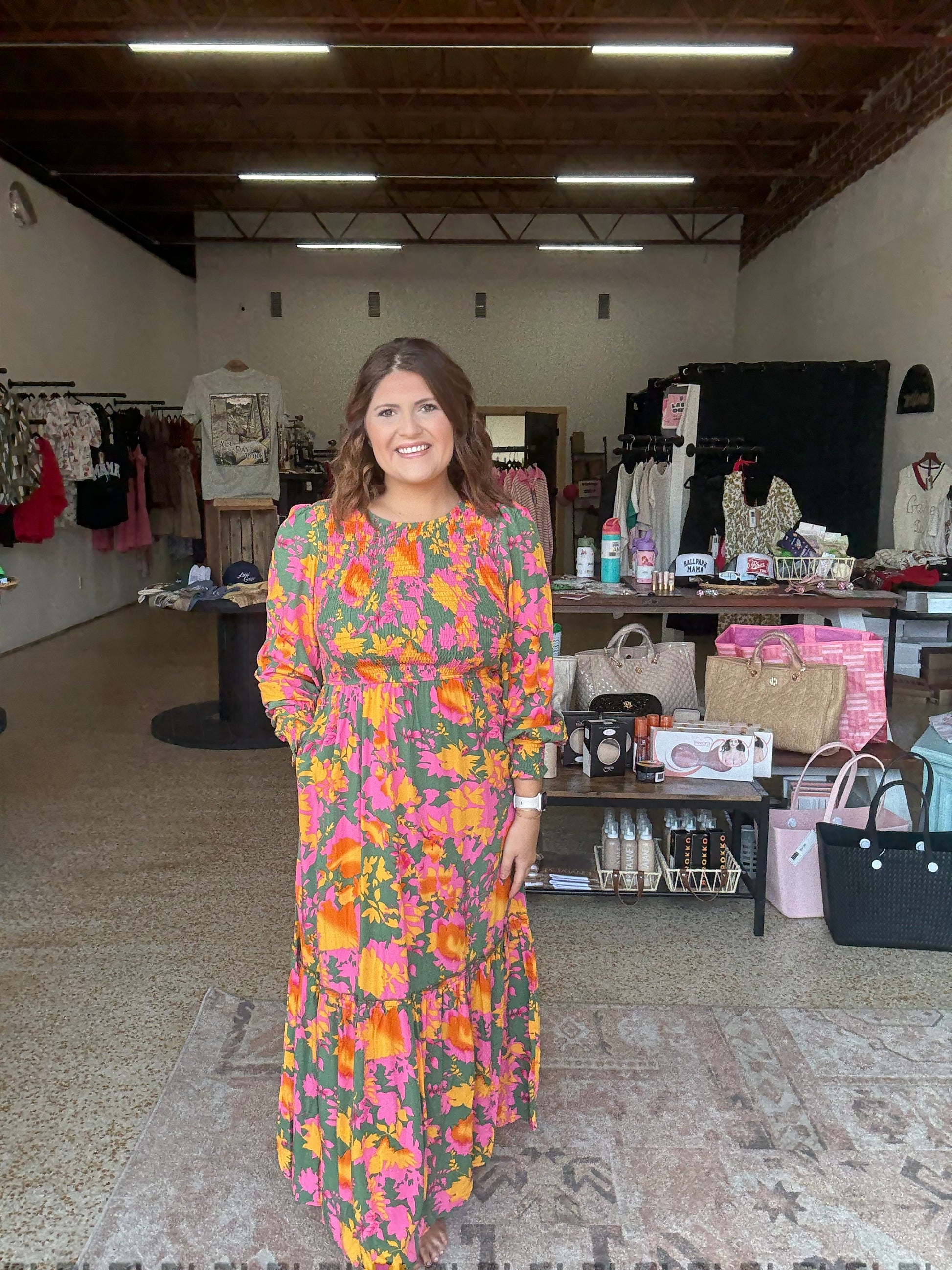 Orange and pink floral dress with a green background with smocking details and long sleeves maxi dress