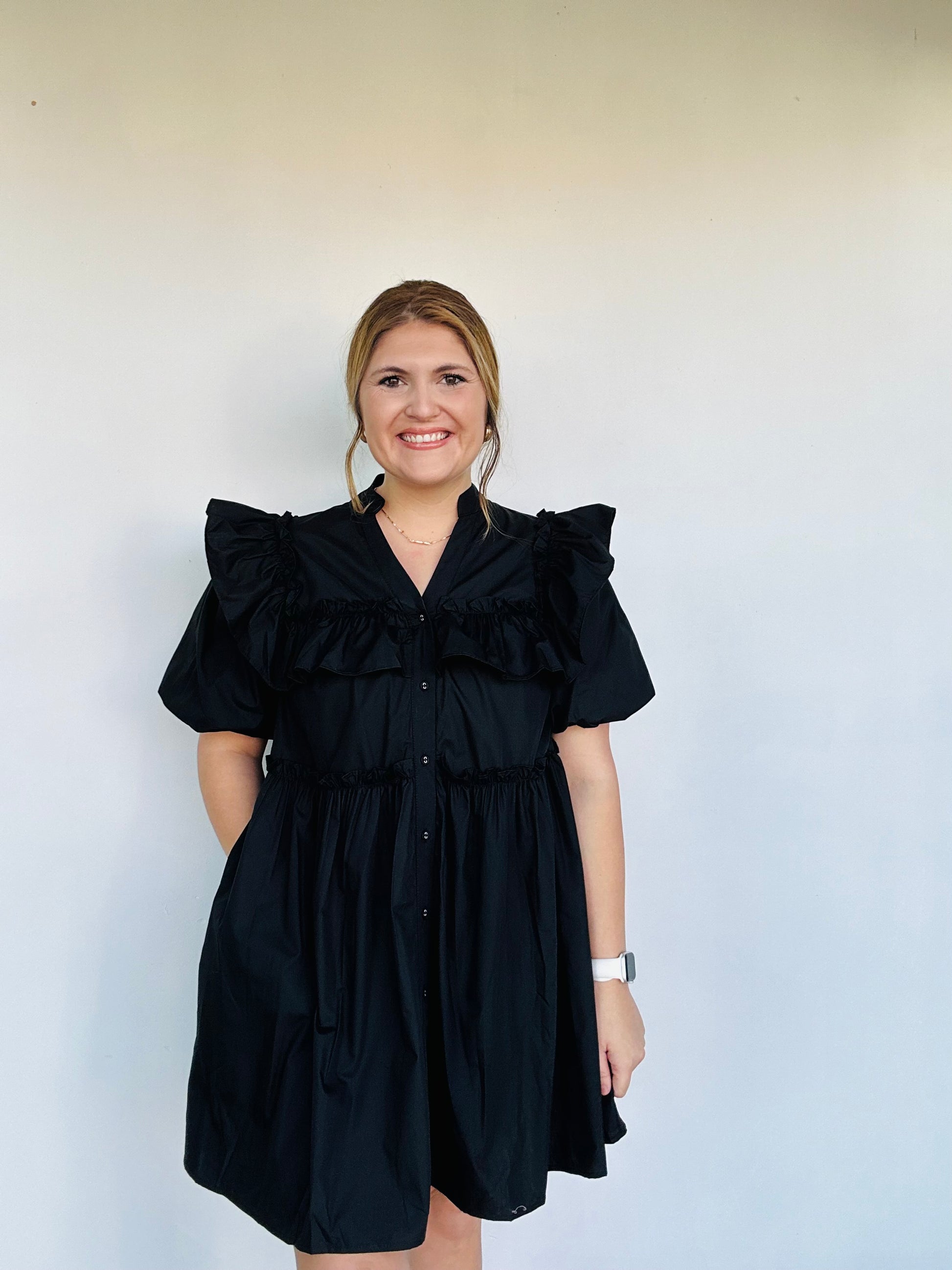 Solid v-neck bubble sleeve button down mini dress featuring ruffle detail. Pocket at sides. Elastic at cuff. Lined. Woven. Non-sheer. Lightweight.