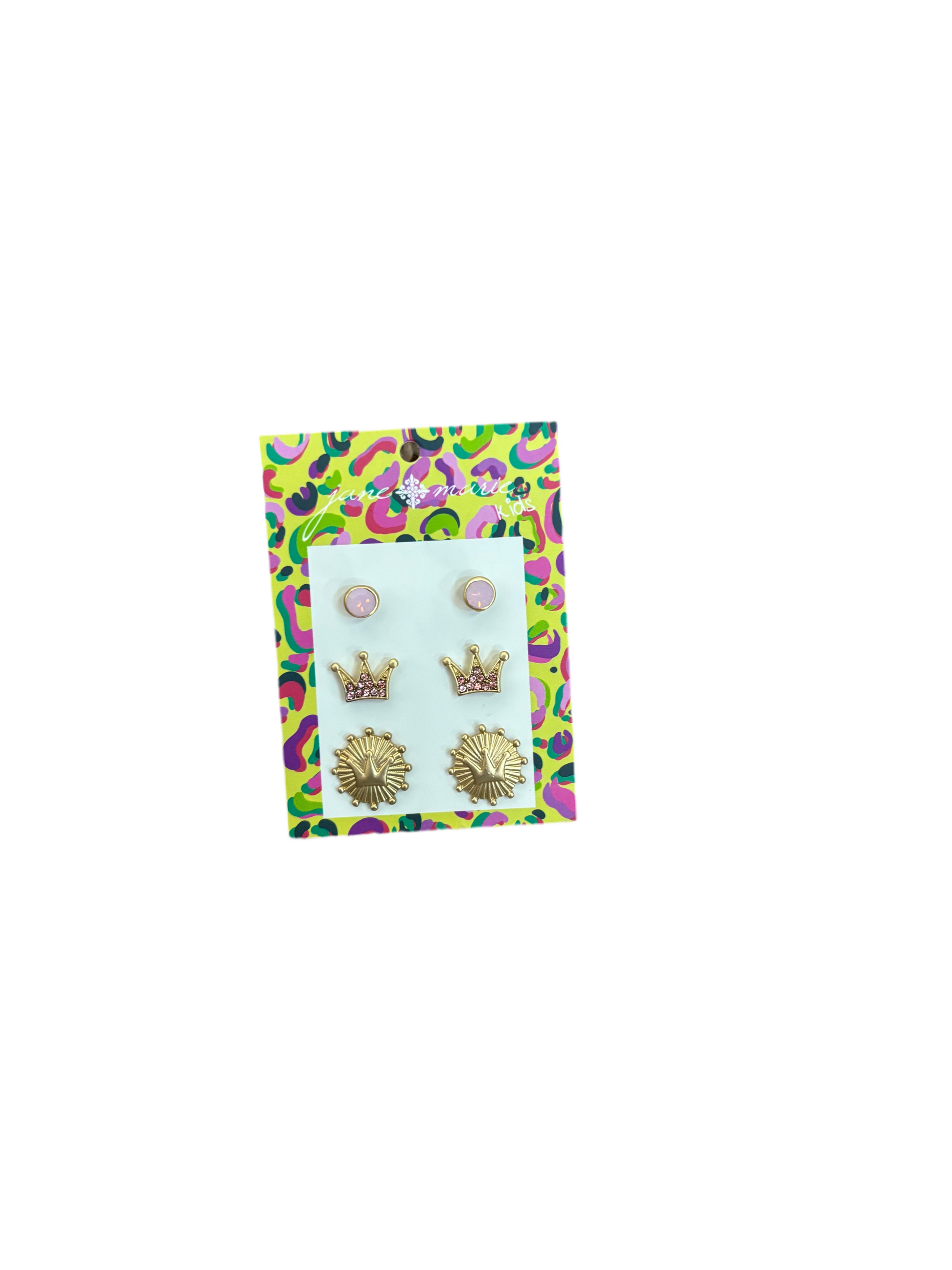 Kids Set Of 3, Pink Crystals, Pink Crystals Crown Earrings